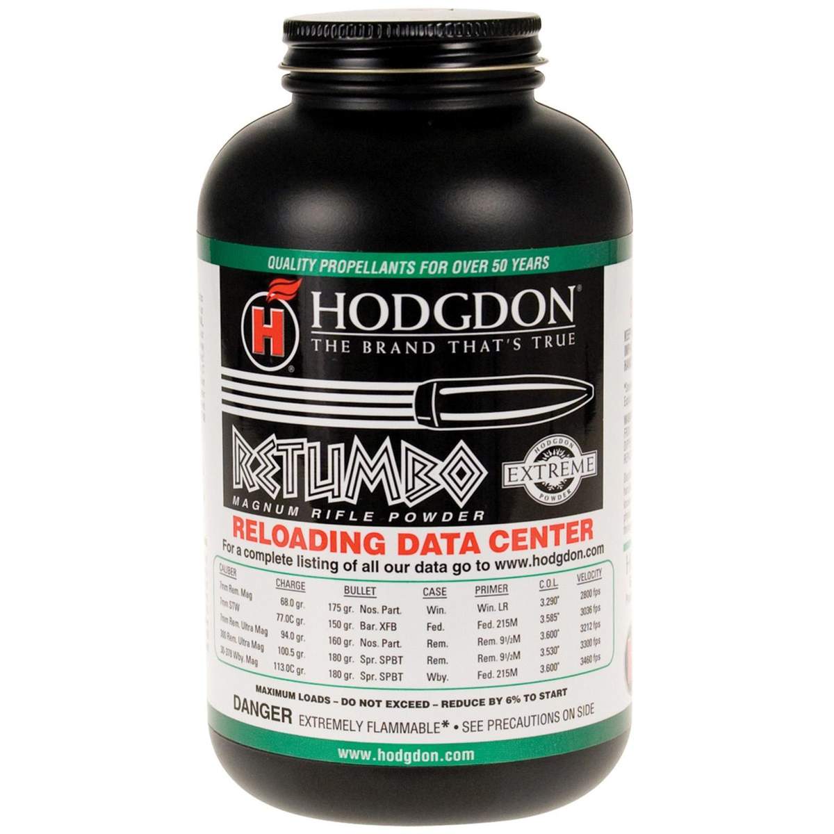Hodgdon Extreme Retumbo Rifle Powder is designed specifically for extremely large over-bored cartridges including .300 Remington Ultra Magnum 7mm Remington Ultra Magnum and .30-378 Weatherby Magnum among others. This powder is capable of adding between 40 and 100 feet per second creating greater velocities compared to other magnum powders of the same type.