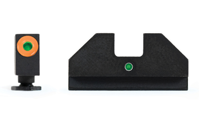 Shoot better day and night. XS F8 night sights increase front sight focus by using a large, high-contrast front sight for fast sight acquisition. The wide notch rear sight easily aligns with the front sight and increases front sight visibility. XS F8 night sights give you the best notch and post solution for fast sight acquisition in all lighting conditions. Green tritium in front and rear glow in low light to aid in sight alignment. Highly visible orange ring is designed for maximum visibility in bright to low light levels, with photoluminescent particles absorbing ambient light to glow in low light. Base of notch in rear sight is rounded to draw focus to the top edge of the sights to aid in proper alignment. Rear sight overhangs back toward shooter to reflect glare down away from the shooter’s eye. Rear sight ledge for one-handed slide manipulations. Fits in common holsters. Install by hand or sight pusher tool. Fits Glock models 42 & 43.